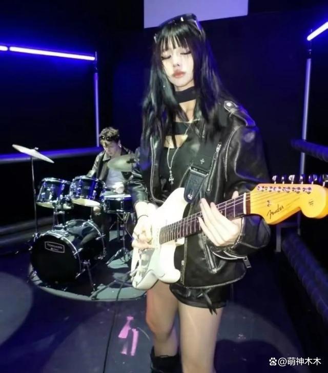 此外,有一张照片中的小苹果身上有着强烈的属于父亲汪峰的影子,她身穿黑色皮质外套,手里拿着乐器,在昏暗的房间里专注地弹奏。