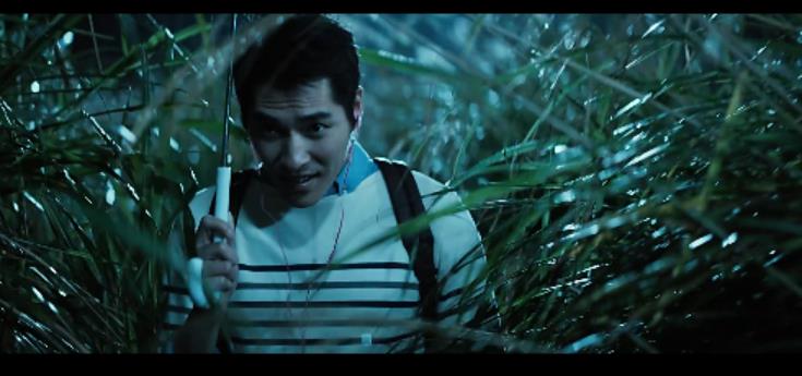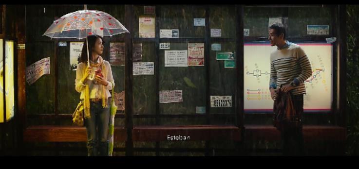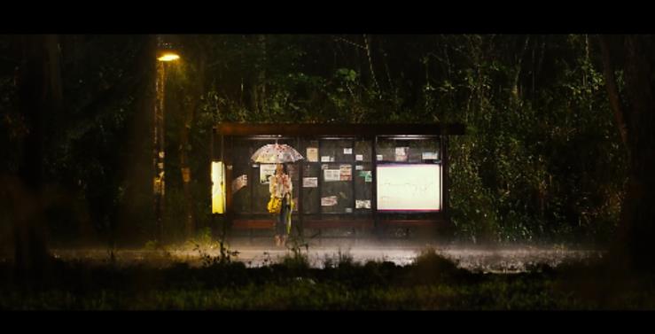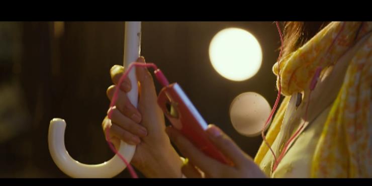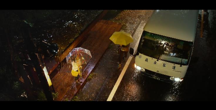 故事开场大雨倾盆,女主人公在雨中听着音乐等待家人!