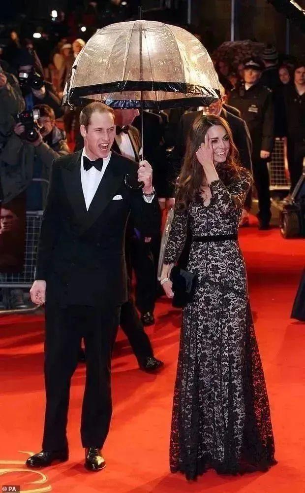 例如,在2012年的电影首映式上,威廉王子并没有和凯特王妃亲密接触,而是绅士地为她撑起了雨伞,保护她的黑色蕾丝裙。