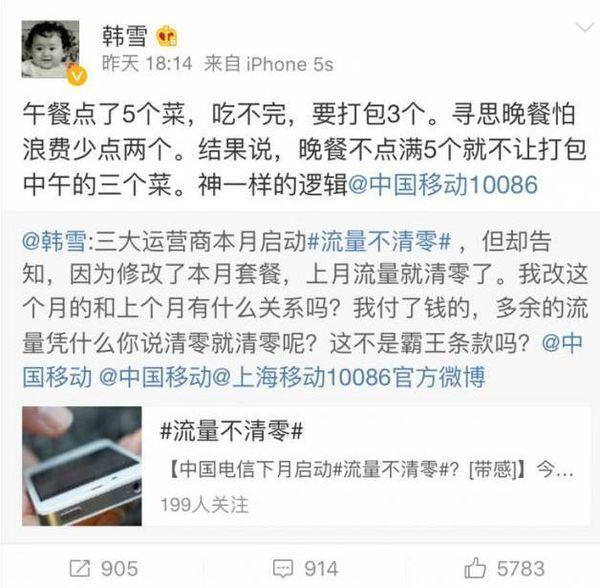 韩雪发了一条微博,抱怨中国移动的"霸王条款"。她很生气的说"三大运营商本月启动流量不清零活动,但却告知,因为修改了本月套餐,上月流量都清零了。我改这个月的和上个月的有什么关系吗!我付了钱的,多余的流量你凭什么说清零就清零?这不是霸王条款吗?"
