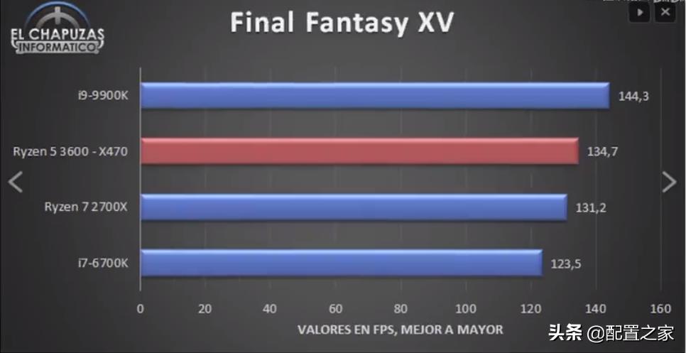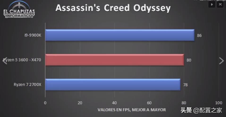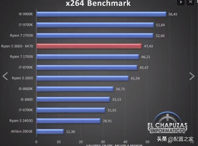 然后,这个是一个视频渲染能力测试图,它表示CPU在每秒可以渲染多少帧视频。图中可以看到R5 3600已经领先了i7-8700K,虽说领先的不多,但它的能力也能满足绝大多数视频制作者的渲染需求。而且,3600上面还有个3600X,更高的主频,其能力会在此基础上进一步提升。