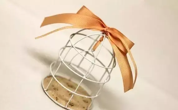 再用粗铁丝和竹签制作出鸟儿的站架,在鸟笼下面用细铁丝固定一个带图案圆形卡纸作为鸟笼的底部,在鸟笼顶端系上一条精美的丝带,一个亲手制作的小鸟笼装饰品就闪亮登场了。最后不要忘记喷上白色的漆哦。