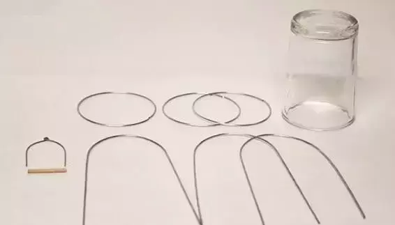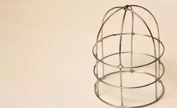 利用玻璃杯将粗铁丝绕出4个圆圈,3个弯型铁丝框架,再按照格尺标注的尺寸,制作出小鸟的站架,把这些东西组装起来,用电焊把连接处焊接牢固,一个小型的鸟笼就初具模型了。
