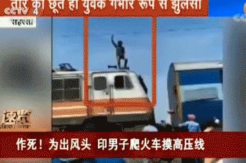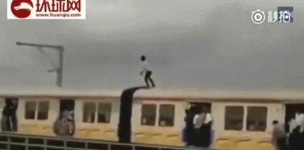在轨道上可能玩不过瘾,于是有人爬上车顶玩起躲电缆。