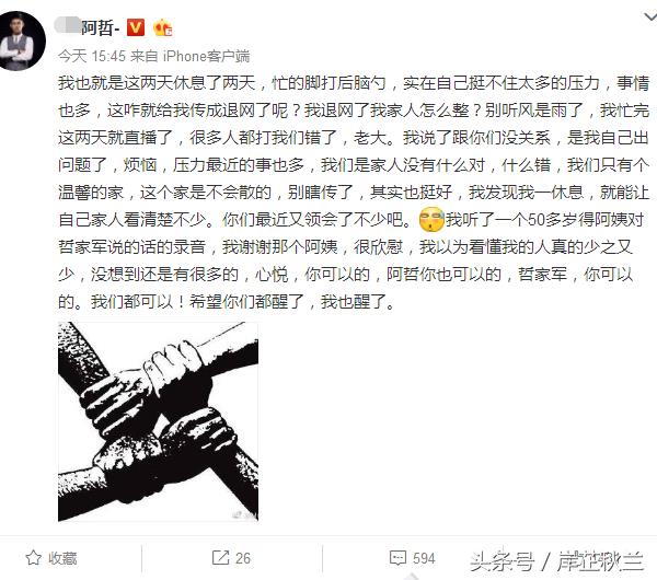 随后阿哲在微博发文表示近期因为太多压力所以停播几天,并没有退网这回事,阿哲听了阿姨的录音,对阿姨以及哲家军铁粉表示感谢,发话阿哲你也可以的,哲家军,你可以的。我们都可以!希望你们都醒了,我也醒了。