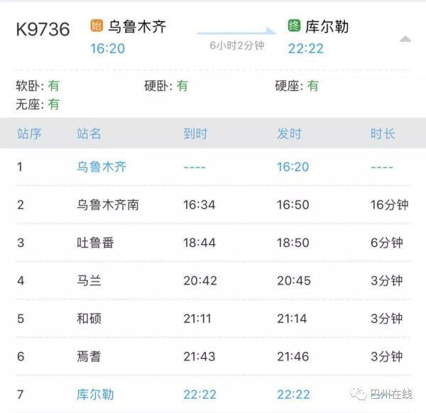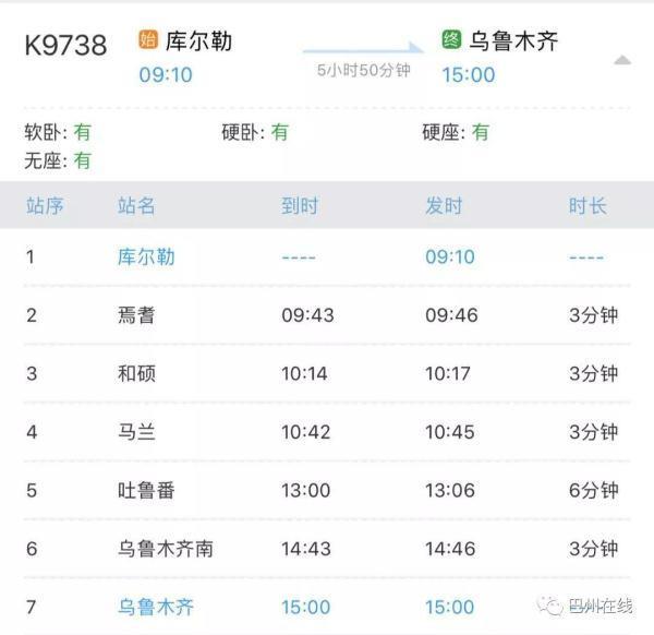 4月30日至5月4日,加开库尔勒至乌鲁木齐K9738/5次,库尔勒9:10开,15:00到达乌鲁木齐。加开乌鲁木齐至库尔勒K9736/7次,乌鲁木齐站16:20开,22:22到达库尔勒。