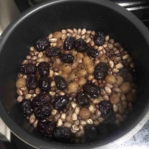 糯米 两碗、阿胶枣 适量、花生 适量、红豆 适量、桂圆肉 适量、红糖 适量、冰糖 适量