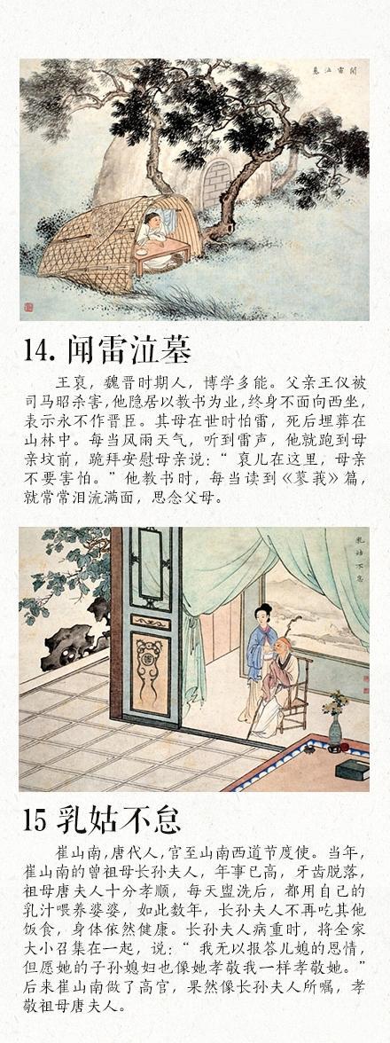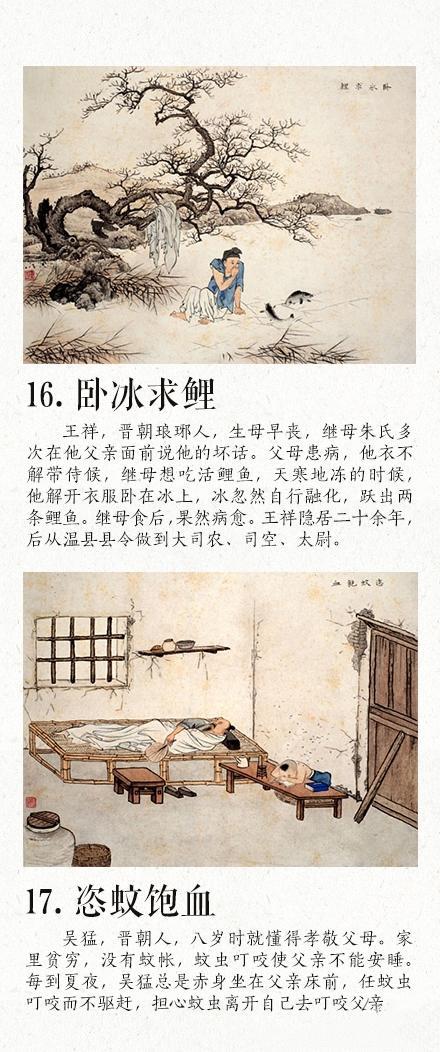 “百善孝为先”,中华文明自古崇尚孝道,通过生动故事弘扬孝道:扇枕温衾、卧冰求鲤、恣蚊饱血、百里负米、闻雷泣墓......这些典故你都知道吗?