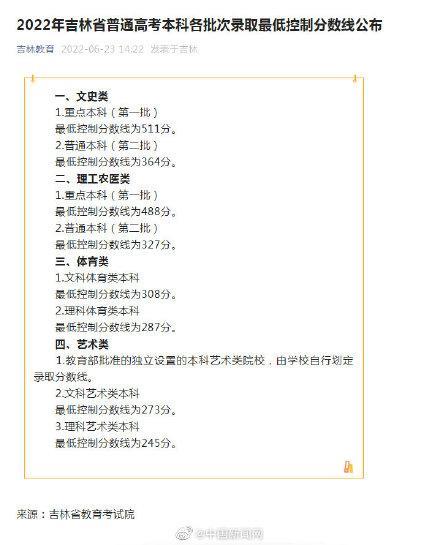 2022年吉林省普通高考本科各批次录取最低控制分数线公布: