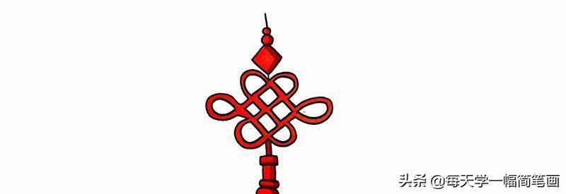 首先我们画出一串吊饰,接着在菱形的下方画上中国结的形状,中间是一个田字形状的方形,边缘有花边,下方再画上流苏装饰,最后就是涂色了,给中国结涂上大红色,简单的中国结简笔画就完成了。