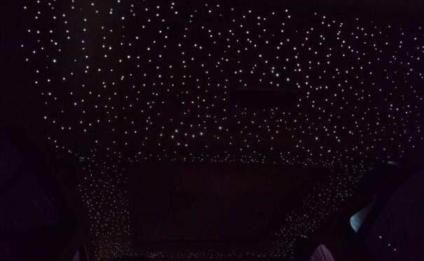 而把灯关闭后,通过图中可以看出,整个顶棚开始闪现出闪闪的星空模样,看着非常浪漫和有档次。据悉,整个顶棚共花了近10个小时,要穿1500多个孔才完成这样一个星空顶棚,可见改装汽车也不是一件容易的事。不过经过这样改装后的宝骏510,简直比劳斯莱斯更有范。当然,在档次上也提高了不少。