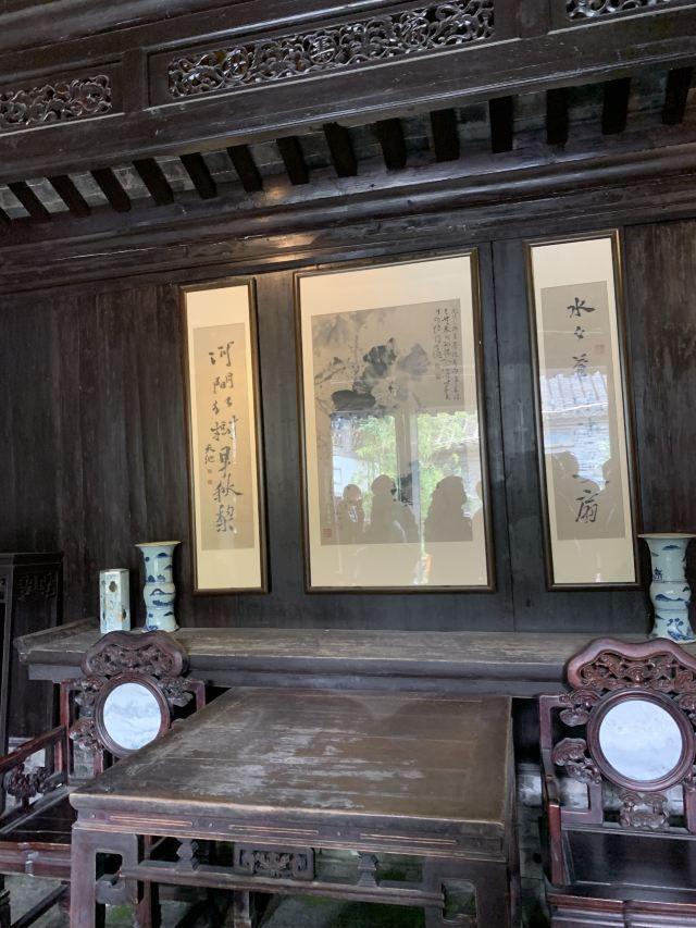 堂屋,又称大堂屋,两侧悬挂着板桥先生书画木刻作品,还有郑板桥同学顾于观、王国栋以及“扬州八怪”金农、李鱓等人书画作品复制件。堂屋正中是徐渭的书画作品复制件。