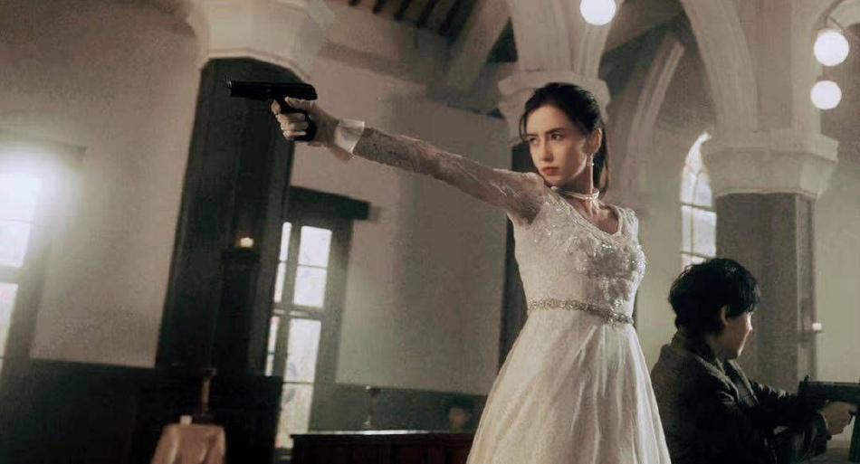 杨颖表现力十足,穿着白纱裙持枪反差感拉满。