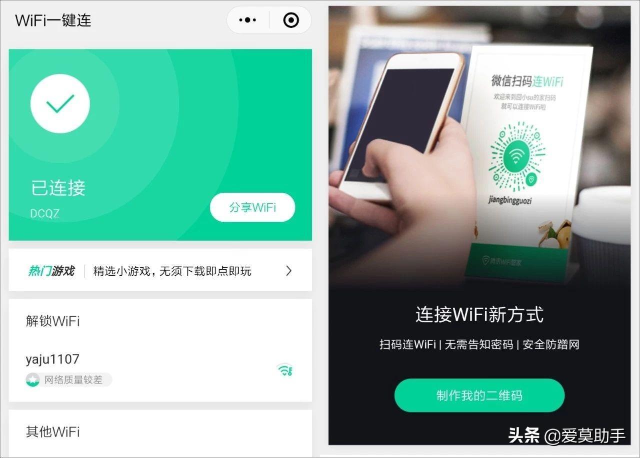 腾讯官方的“WiFi一键连”小程序可以帮助我们快速连接周边的WiFi,自动解锁部分加密WiFi。除了可以解锁周边WiFi,该小程序还支持自制WiFi二维码,春节期间亲朋好友来到家里时,只需要用手机扫描二维码即可一键连接,无需输入密码,省事又快捷。