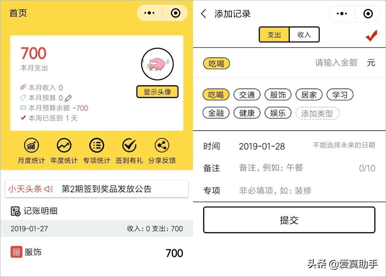 天天随手记账是记录社交场景中收支的社交化记账小程序,可快速对日常开销、节假日支出等进行记录。支出场景提供了吃喝,交通、服饰等多种类型;在收入场景下有投资,工资、租金等可供选择。在记账时可以再次添加更详细的备注,春节期间的各种购物开销,送礼、收礼等都可以详细记录。