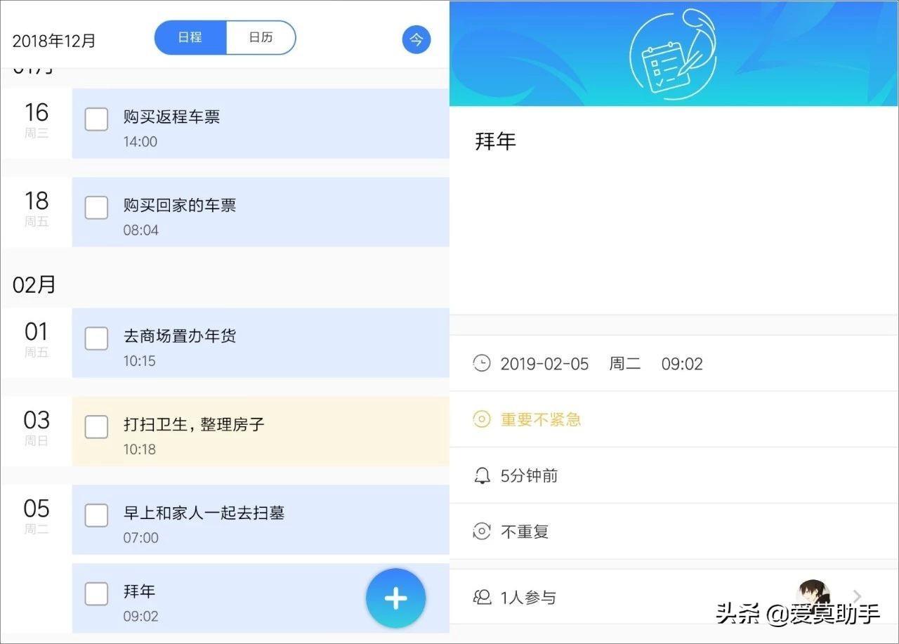 一个帮你高效完成任务和规划时间的小程序应用,拥有跨设备云同步,语音输入日程、周期提醒、清单管理、清晰分类、协作和集成日历的应用。可以用来制定节假日计划,记录春节期间的购物清单、设置拜访亲朋好友的日程提醒。有直观的日历视图与朋友共享任务。无论是同事之间的团队任务,还是朋友之间的旅行计划、购物清单,都可以在爱莫能记中共享并讨论。
