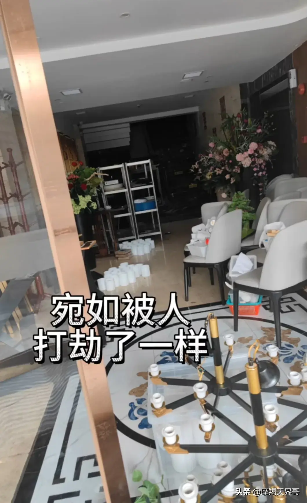 里面各种杂物散落一地,跟被洗劫过一样,听物业的人说这个餐厅欠了供货商的钱没给,被堵了几天门后就放假了,好多天没营业了。
