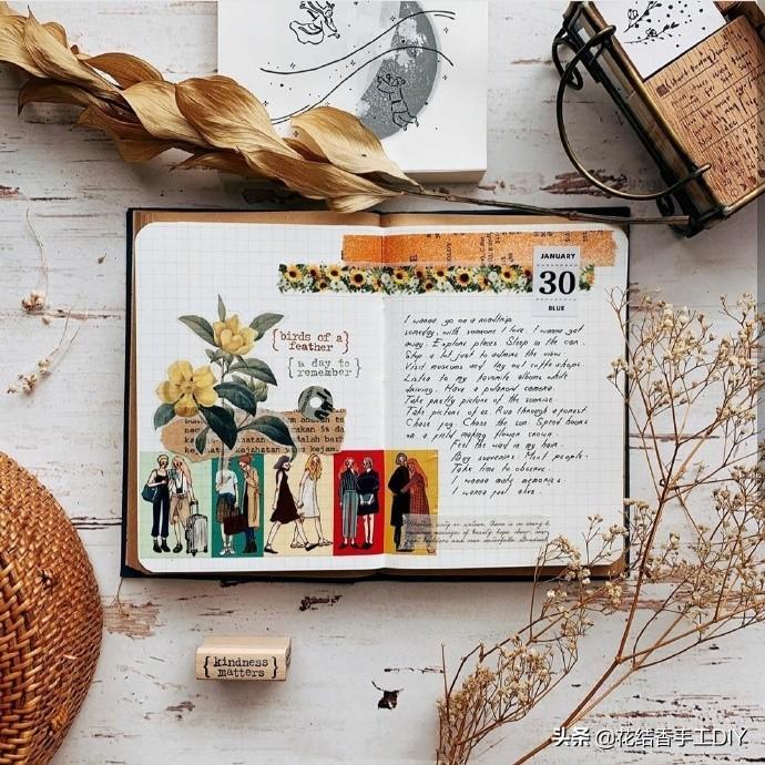 手账素材多种多样,除了市面上出售的手账贴纸、手账胶带,还有各种随手可以得到的手账素材,比如邮票、报纸、商场小票、旧的明信片、英文报纸,做衣服剩下的花边、蕾丝和各种花色的小布头~~统统可以拿来做手账呀~~