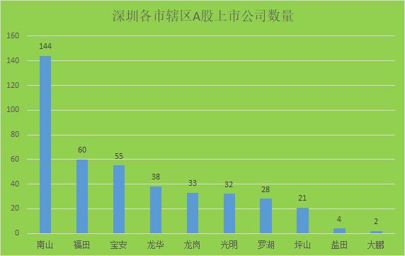 南山区144家,福田区60家,宝安区55家,龙华区38家,龙岗区33家,光明区32家,罗湖区28家,坪山区21家,盐田区4家,大鹏新区2家。南山区A股上市公司数量遥遥领先,其它超过30家的市辖区还有福田、宝安、龙华、龙岗、光明等5个区。笔者注意到,老宝安区(宝安+光明+龙华)的A股上市公司合计多达125家,老龙岗区的A股上市公司也有56家。原关内4区中的罗湖区只有28家A股上市公司,盐田区更是只有4家A股上市公司(见下图)