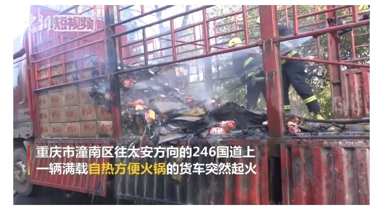 近日有新闻报道,重庆某国道上有摩托车发现一辆货车突然起火,而货车司机并没有察觉。随后消防到场救援,大约20分钟后火势得到完全控制,无人员伤亡。据称货箱里装有大约2吨用纸箱装好的方便火锅,被烧得一片狼藉。