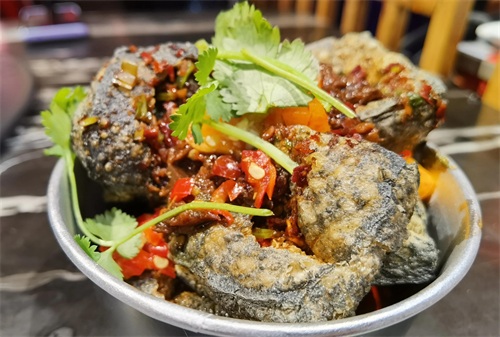 火宫殿美食首推臭豆腐。有传说源自北京的王致和臭豆腐,事实并非如此。据《长沙饮食志》载,长沙臭豆腐源自左宗棠老家~湖南湘阴县,起初叫油炸豆腐,当年由湘阴县传入长沙后被姜二爹发扬光大,做出了特色,成为上个世纪三四十年代火宫殿小吃中一绝。后来火宫殿根据长沙人的口味进行了改进,挑选色泽新鲜、颗粒饱满的黄豆,制成老嫩适宜的豆腐坯,用冬菇、香冬笋、曲酒、浏阳豆豉等原料制成的发酵水浸泡,沥干水分后慢火油炸,再在豆腐中心钻一小孔,灌入辣椒末、酱油、芝麻油等佐料。火宫殿臭豆腐具有“黑如墨,香如醇,嫩如酥,软如绒”的特点。