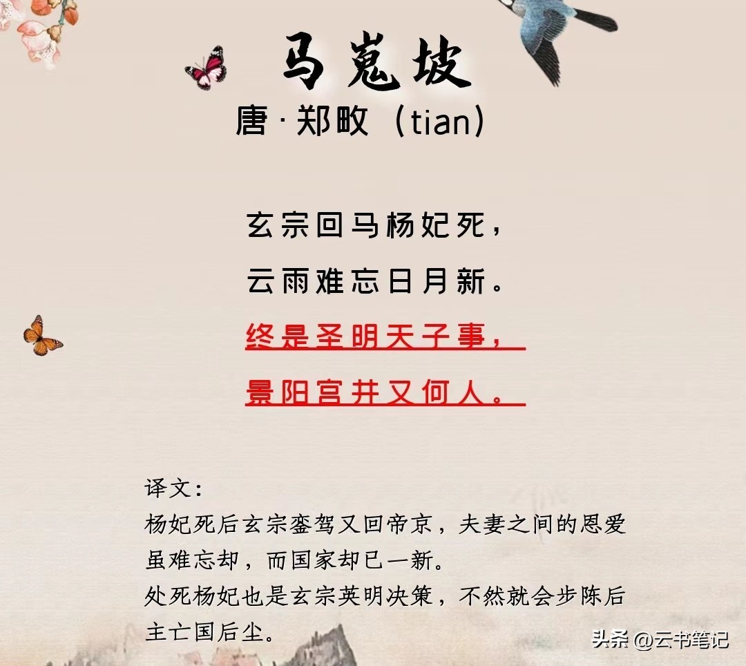 《马嵬坡》是唐代诗人郑畋(tián)的作品,全诗是这样写的“玄宗回马杨妃死,云雨难忘日月新。终是圣明天子事,景阳宫井又何人。”