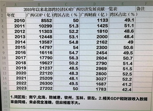 从统计情况分析,当年自治区定位以湾区为广西经济发展重点区域,以及中央近三十年来要求广西要向南向海沿边发展经济,是对的,湾区自2006建成到2010年经济总量和财政总量贡献过半至今无论经济总量或是财政总量的贡献都是显著的,并且从统计情况看,目前广西的经济,若湾区出现问题,财政总量就会明显下降。从统计中也发现,首府经济与财收,已经占到全区的五分之一强以上。因此,借助湾区向南向海沿边区域发展优势和强首府战略,谋划广西整体发展,已是广西高质量发展的必由之路,不可怠慢,更不能回头,其他市必须全力以赴响应号召与支持广西这两项重大决策,为建设高质量发展的壮美广西而努力奋斗!