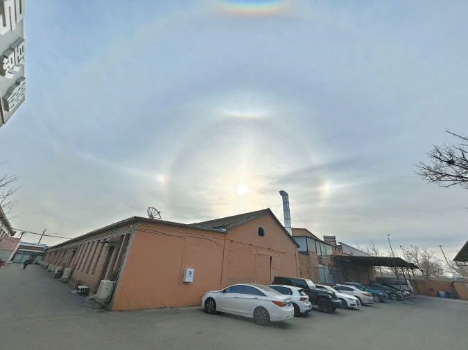 今天上午,天空中的太阳似乎有些特别,有一个光圈环绕在太阳外围,天空中似乎出现科幻作品《三体》中的三个太阳景象。