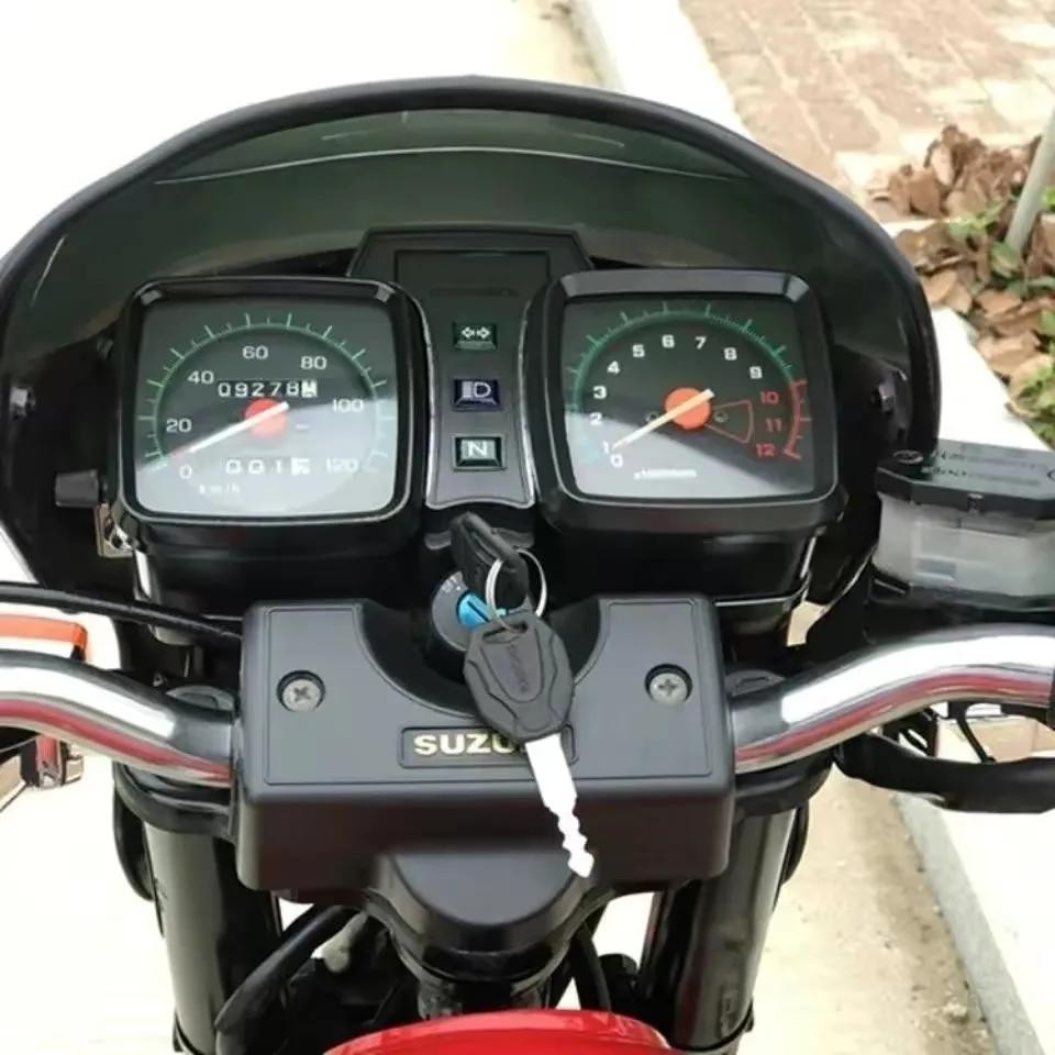 铃木GS125车身颜色多为鲜艳的大红色,与黑色车身、白色SUZUkI的LOgo搭配非常靓丽。采用双仪表设计,左侧为里程速度表,右侧为转数表,中间有转向大灯开启指示、档位显示功能。整体包裹在前导流罩里,既增添了美观,又起到挡风遮阳的作用,查看数据时也清晰明了。