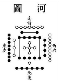 河图上,有排列成数阵的25个白点和30个黑点,蕴藏着无穷的奥秘。白点是单数(一、三、五、七、九),代表阳、天,黑点是偶数(二、四、六、八、十),代表阴、地。此一白一黑,既含阴阳、天地运行之道,又寓五行、四象变化之理,黑白点共55个,所以又称“凡天地之数五十有五”。一六在后,象北方壬癸水,玄武星象;三八在左,象东方甲乙木,青龙星象;二七在前,象南方丙丁火,朱雀星象;四九在右,象西方庚辛金,白虎星象;五十在中,象中央戊己土,表示时空奇点;五行之金木水火土及方位东西南北中源于此。而中间五点,又象太极含四象;中一点,又象太极含一气。
