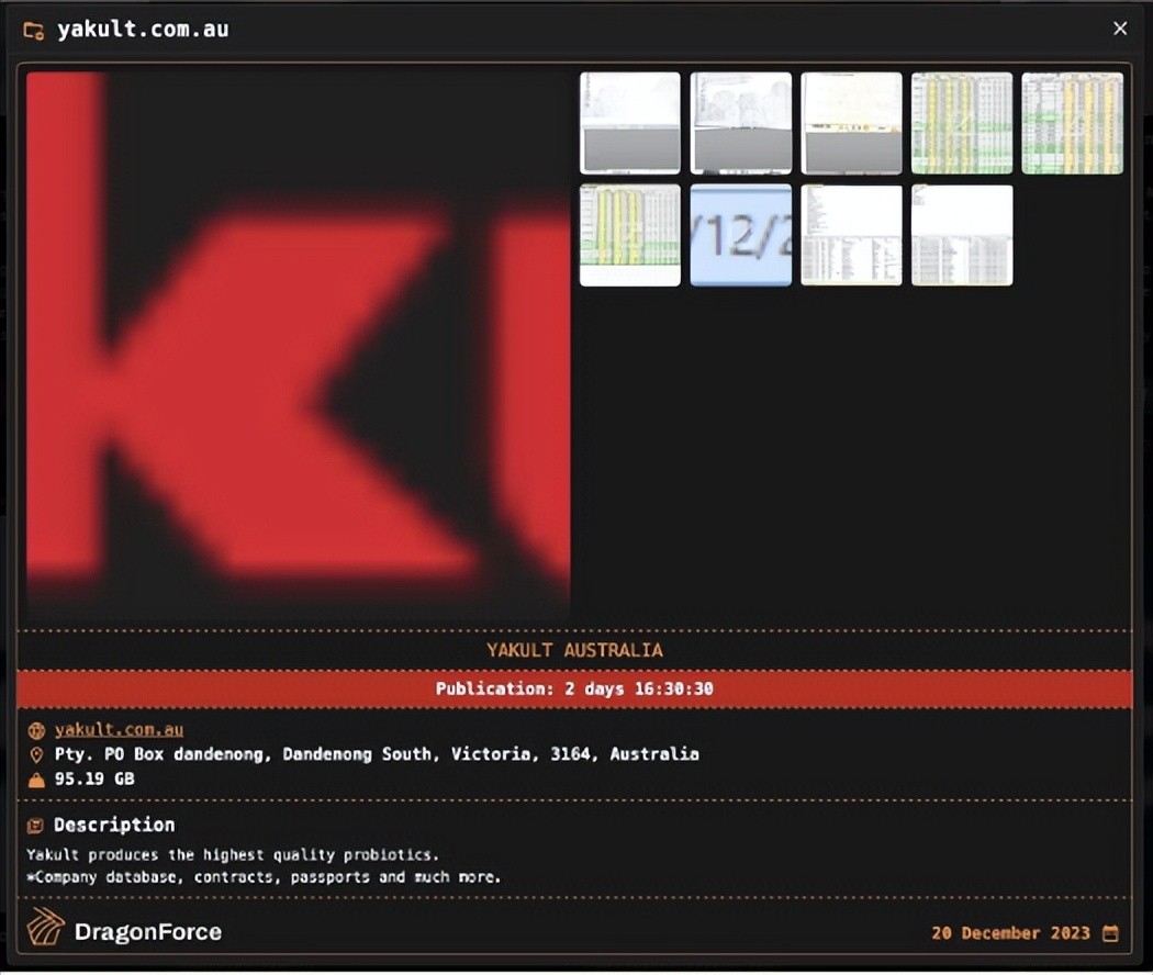 一名自称“DragonForce”的网络犯罪分子对这起事件负责,并于12月20日将养乐多澳大利亚公司列入其洋葱泄漏网站,同时公开威胁要泄露95.19 GB的数据,该组织现在已经这样做了。据威胁行为者称,数据泄露包含“公司数据库、合同、护照等等”信息。