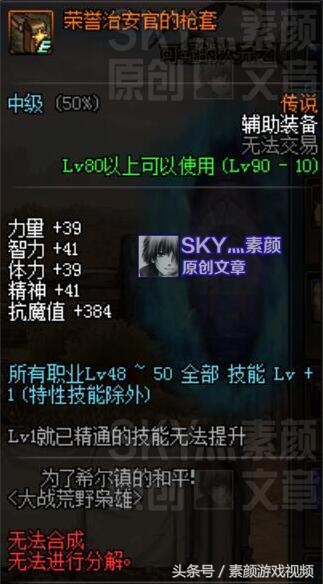 枪套(辅助装备)可增加40点左右的四维数值,可使所有职业48-50级的技能等级+1。枪套的效果和血色残阳礼帽是一样的,可以作为部分职业过渡级别的一件一觉换装装备使用。