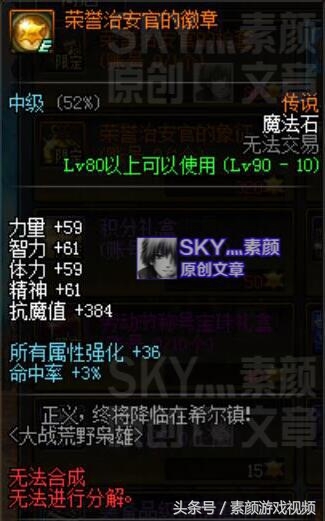 象征(耳环,感觉有点模仿英雄王的象征……)有着80点左右的基础四维加成,可增加30点物理、魔法和独立攻击力(品级调高以后,数值应该会上升至38点左右,这里拿不太准,还是按照30点来计算)。