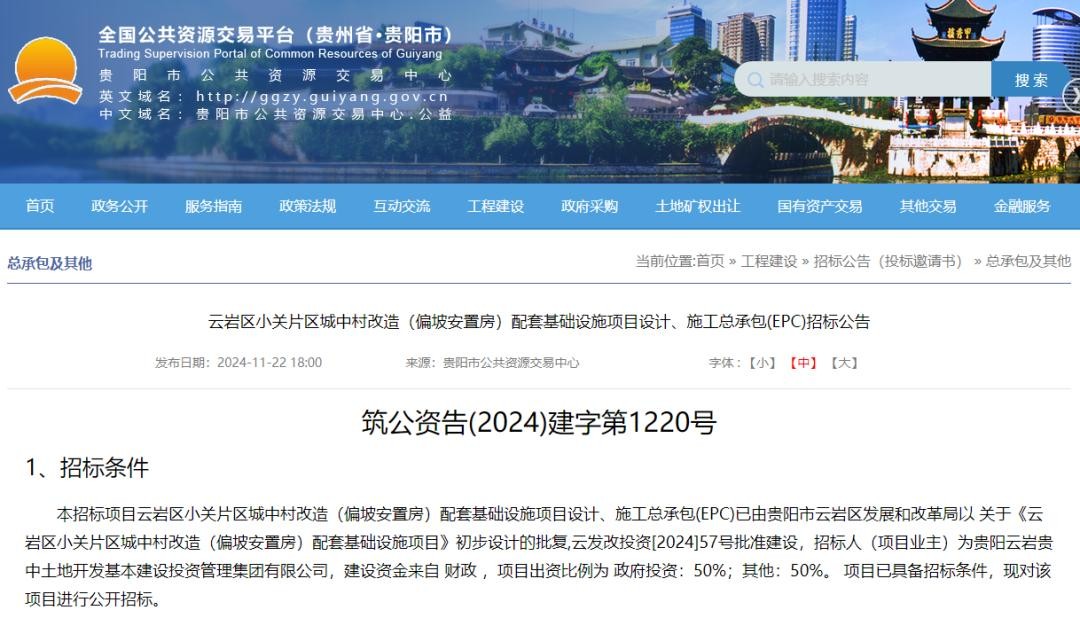 11月22日,贵阳市公共资源交易中心发布云岩区小关片区城中村改造(偏坡安置房)配套基础设施项目设计、施工总承包(EPC)招标公告。