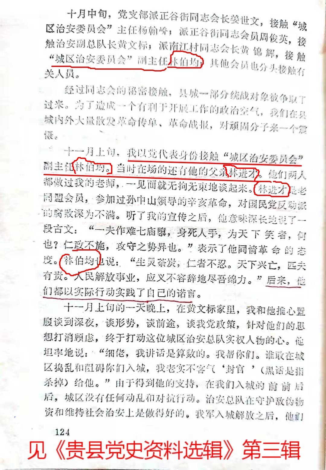 1949年,贵县解放前夜,梁寂溪书记代表中共县工委,先后向林进才等知名人士发信。后来周卫邦以党代表身份接触“城区治安委员会”副主任林伯均时,林进才也在场。父子两人都对国民党反动派的腐败深为不满,最后以实际行动,对贵县和平解放作出贡献。