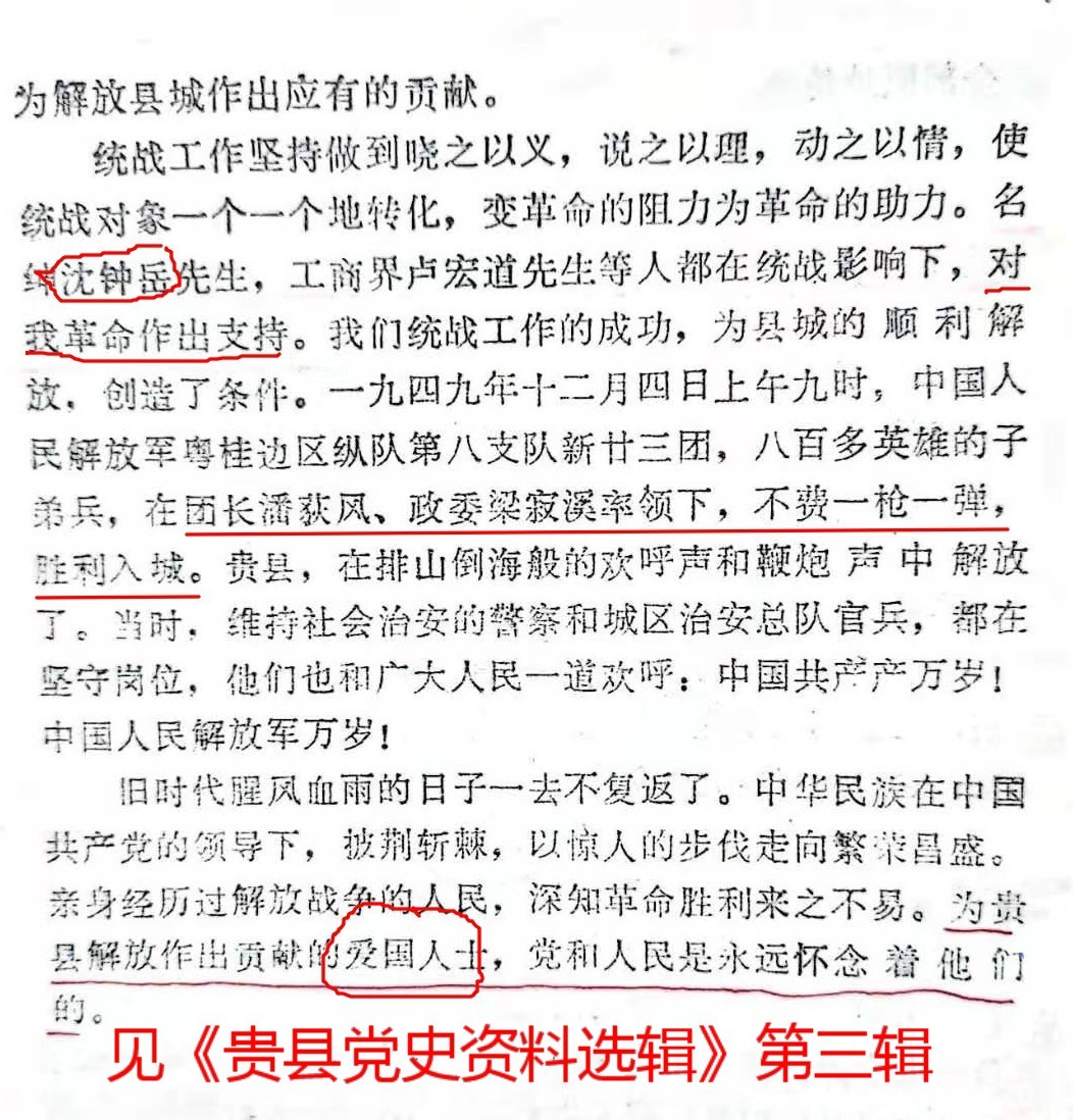 2、沈毓卿(即沈钟岳,笔者爷爷),早年留学日本,归国后曾两度出任贵县县长和横县、岑溪等县县长。1927年“4·12”反革命事变后,他在接到省府拍来要抓捕中共党员陈勉恕等人的密电后,有意使人透露消息,让这批社会精英走避。1949年,沈公对党的统战工作给予支持配合,为解放军顺利入城解放贵县创造了条件。