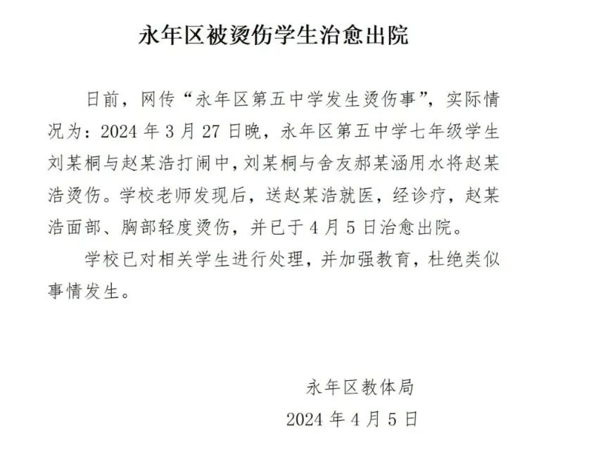 日前,网传 " 永年区第五中学发生烫伤事 ",实际情况为:3 月 27 日晚,永年区第五中学七年级学生刘某桐与赵某浩打闹中,刘某桐与舍友郝某涵用水将赵某浩烫伤。学校老师发现后,送赵某浩就医,经诊疗,赵某浩面部、胸部轻度烫伤,并已于 4 月 5 日治愈出院。