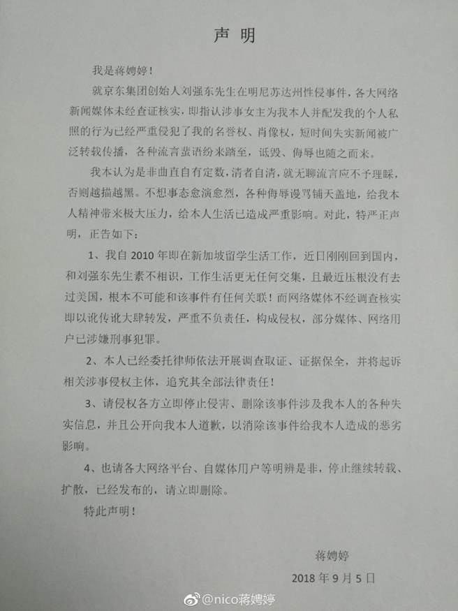 44岁京东商城创始人兼现任CEO刘强东3年前与「奶茶妹妹」章泽天结婚,育有一女,近日刘强东被爆在美国卷入性侵案被捕,目前人已获释回到国内,网上传出该案受害人疑为性感网红「蒋聘婷」,对此,蒋聘婷稍早首度发声,否认自己是刘强东性侵案原告,要求撤下不实报导,否则将采法律途径维护名誉。
