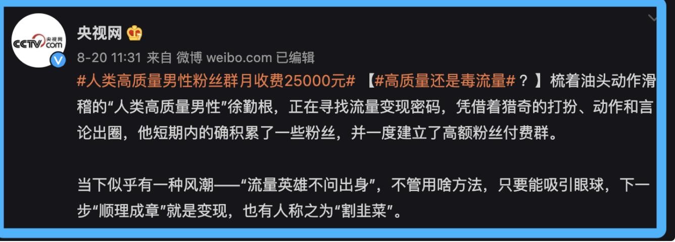 走到这里,算是彻底踏破了法律的红线,央媒纷纷下场点名批评。央视网直批:油头动作滑稽的“人类高质量男性”徐勤根,正在寻找流量变现密码,凭借着猎奇的打扮、动作和言论出圈.....