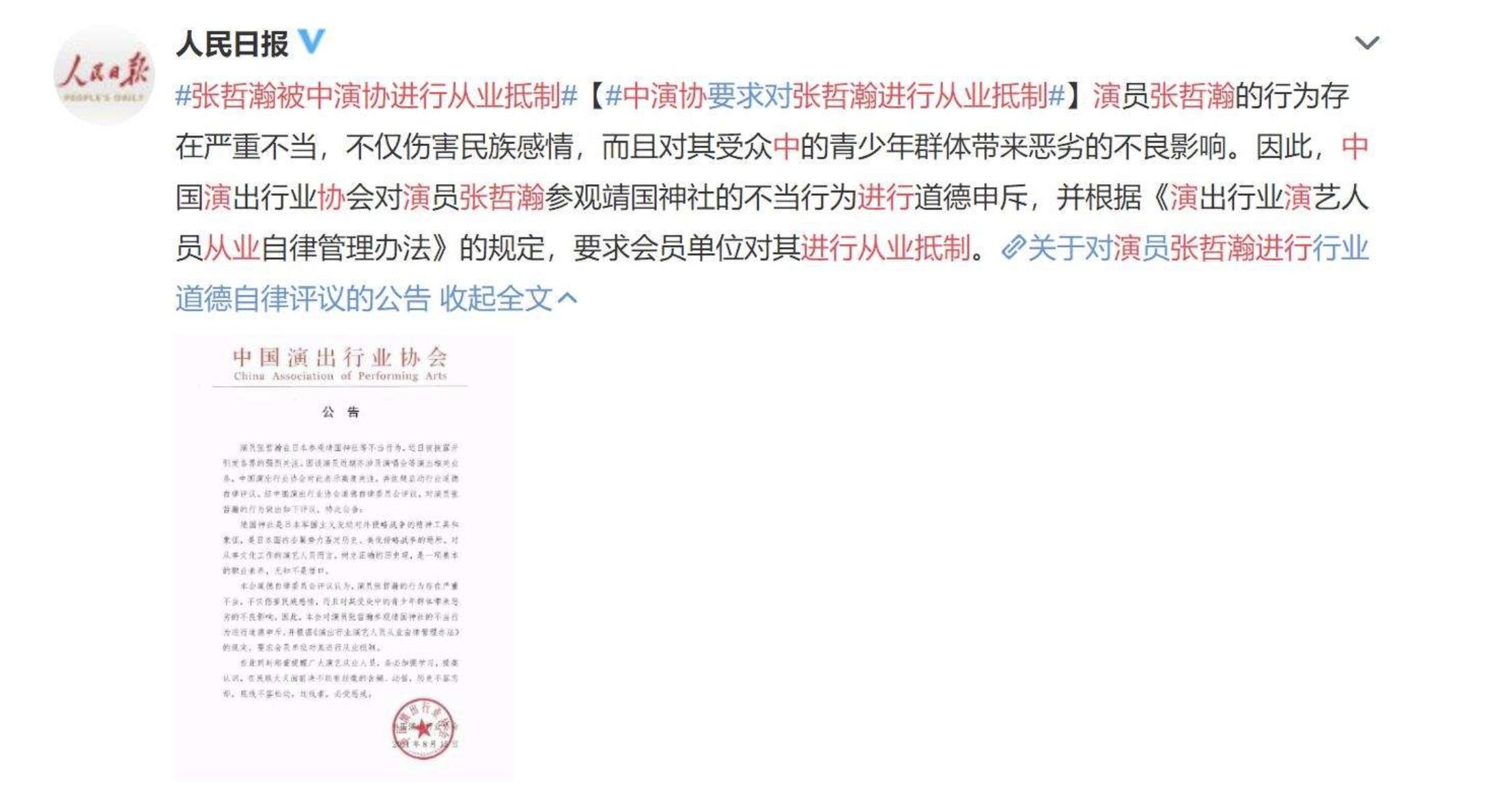 2021年8月15日,中国演出行业协会发出公告,对演员张哲瀚参观靖国神社的不当行为进行道德申斥,并根据有关规定,要求会员单位对其进行从业抵制。