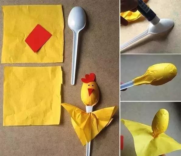 准备材料:塑料勺子、彩色薄纸、彩纸、固体胶、卸装棉圆形、塑料小眼睛、笔、剪刀