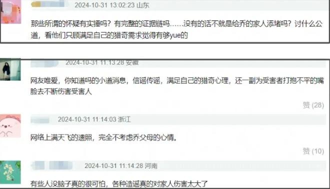 网友们对这起事件反应强烈,纷纷发声支持严惩造谣者。有人感慨:"乔任梁是那么阳光开朗的一个人,为什么要用这么阴暗的想象去玷污他的记忆?"还有人指出:"这些谣言不仅伤害了逝者,更是对其家人的二次伤害。"