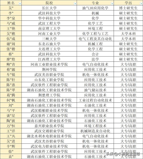 3.2024年荆门石化应届高校毕业生录用分析。荆门石化2024年度校园招聘拟录用人选已公示,拟录用30人,博士1人,硕士8人,本科2人,大专/高职19人。从录用高校来看,湖南石油化工职业技术学院5人,武汉软件工程职业学院3人,武汉光谷职业学院、武汉科技大学2人。从录用专业来看,应用化工技术6人,机电一体化技术4人,石油化工技术3人,电气自动化技术2人。