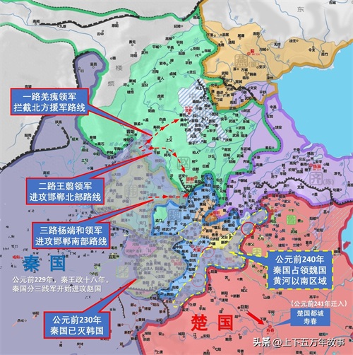 秦军趁赵国大饥荒之机,依照三年前的进军路线,从三个方向对赵国发动进攻。一路由王翦率军出井陉(今河北井陉西)从北方南下进攻邯郸,一路由羌瘣率军同出井陉,向番吾之战进军以阻碍赵国北方军南下支援;另一路由杨端和率军从南面进攻邯郸都城。秦国还是用的老套路,这次能成功吗?
