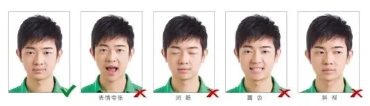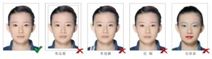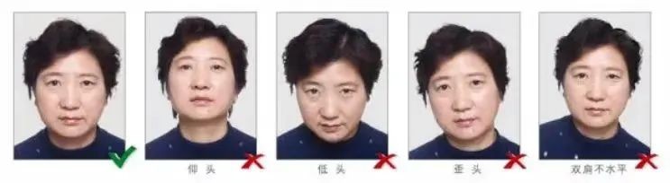 衣着:宜着深色有领服装(衬衫、圆领、小V领等,领口不得过大),不得穿着制式服装(如工作服、警服、学生服),不戴帽子、头巾、耳环项链等饰品;非永久性饰物不得遮挡脸部;