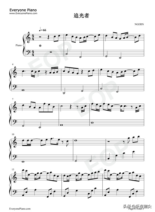 追光者-C调简单版-简谱五线谱钢琴谱电子琴谱