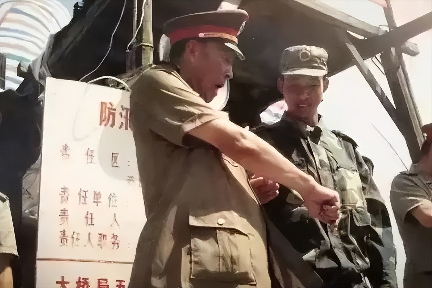 董万瑞站在堤坝上指挥作战,任凭风雨打在身上。这位57岁的老将军不顾众人劝阻,亲自跳入江水中与战士们并肩作战。