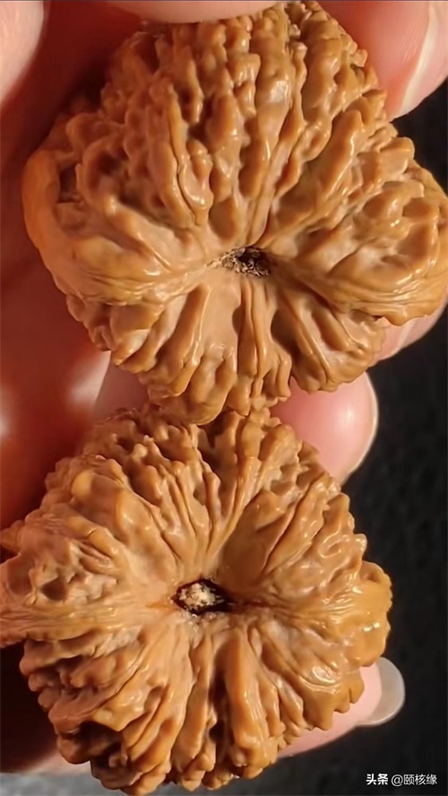 南疆石的密度极高、骨质极佳,也正是因为这个原因,上色包浆极慢,甚至有盘玩一两年的南疆石核桃仍然是姜黄色,这就需要玩家有足够的耐心和经验,而且有十疆九歪的说法,也就是说十对配好的南疆石里,有九对的桩型都是歪的,只有难得的一对足够正!所以,品相好的老树窝底南疆石,几乎是一下树就被收走了,能流入市场的很少,市面上常见的基本都是嫁接的,专属于老南疆石核桃的那些特征,也逐一慢慢消失了!