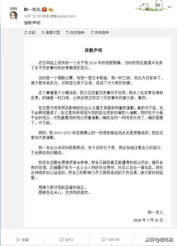关于陈一发儿被封杀这件事,2018年7月底时候,一段2年前她直播的“口嗨”视频被@江苏网警曝光,在直播过程中,陈一发儿把南京大屠杀、东三省沦陷等民族惨痛记忆,作为调侃的笑料...