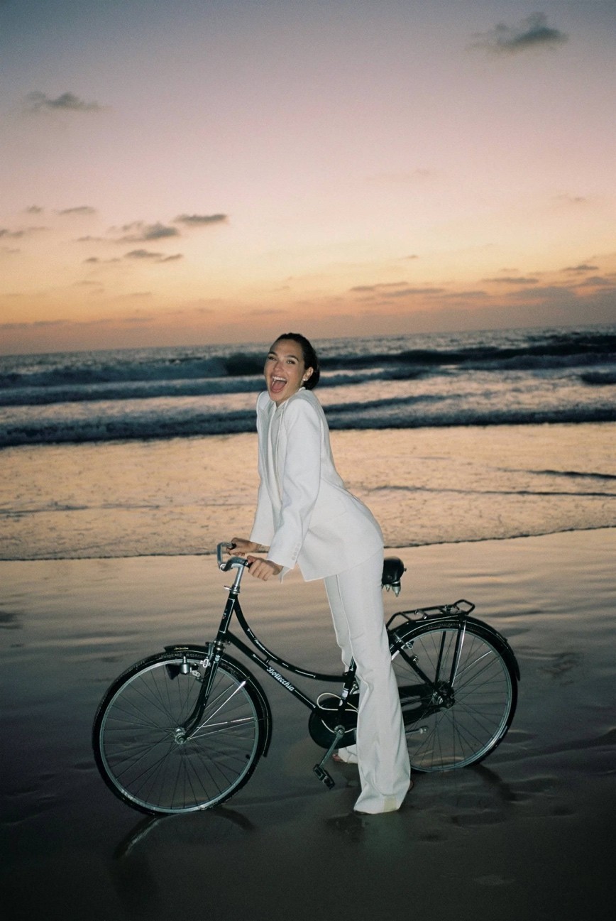 盖尔加朵赤脚站在沙滩上,她身穿一套白色宽松西装,手里还扶着一辆自行车。她整个人开怀大笑,看上去心情十分的不错,配合落日下的场景氛围别样的浪漫。